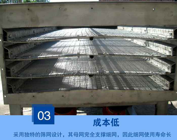 作為為常見的一種振動(dòng)篩,采用獨(dú)特的篩網(wǎng)設(shè)計(jì),其母網(wǎng)完全支撐細(xì)網(wǎng),因此細(xì)網(wǎng)使用壽命長,降低了細(xì)網(wǎng)的耗材使用,長時(shí)間的生產(chǎn)可降低諸多成本,方便和快速更換篩網(wǎng) 。