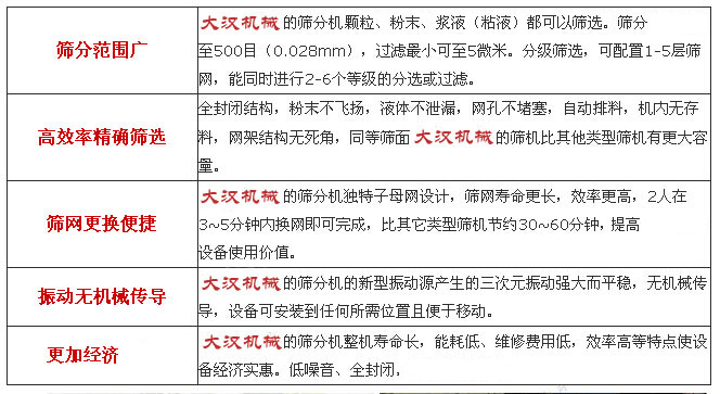 大漢機械生產的不銹鋼篩分機可根據客戶不同需求,從篩面直徑400-2000mm,各種型號齊全,可滿足各種粉末、顆粒篩分需要求及液體過濾需求,也可設計為閘門式旋振篩、加緣式旋振篩等機型。使用范圍廣泛,0-500目的干、濕、精細、粗糙、大小比重粉末、顆粒可輕松篩選,0-600目漿態物料可輕松過濾。我們針對不同用戶物料特性、處理量、篩分目標、場地限制、生產線配置等不同特點的需要,為每一位用戶量身打造適合自己使用的篩分機設備。